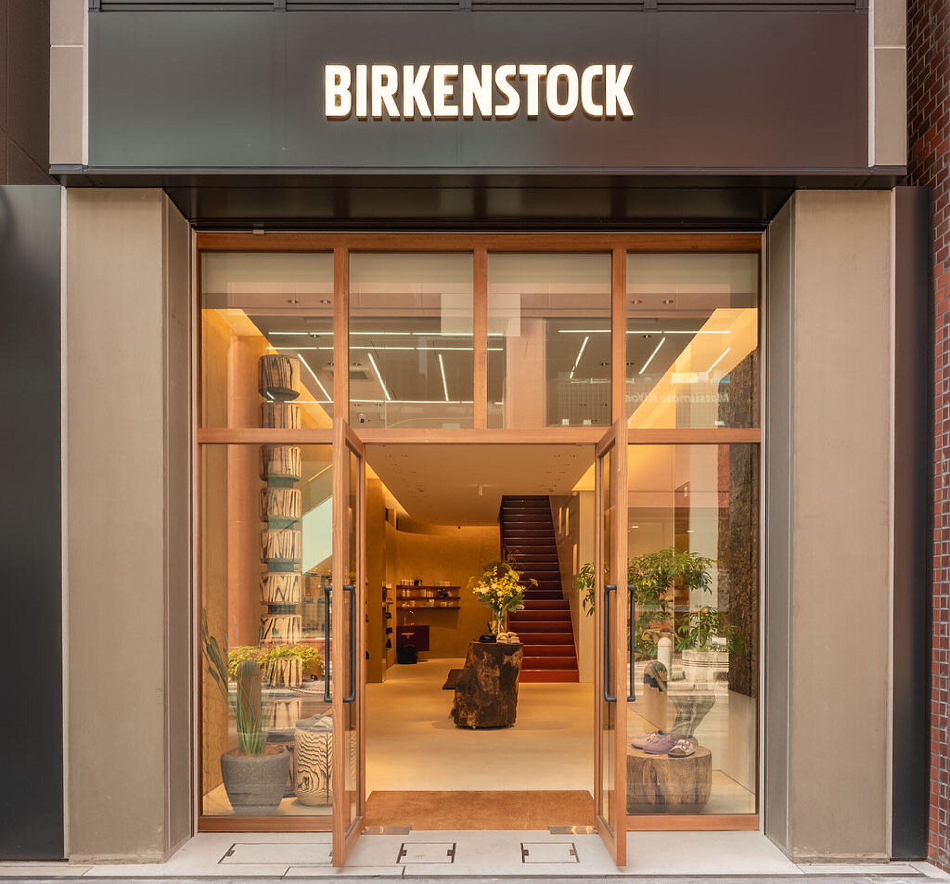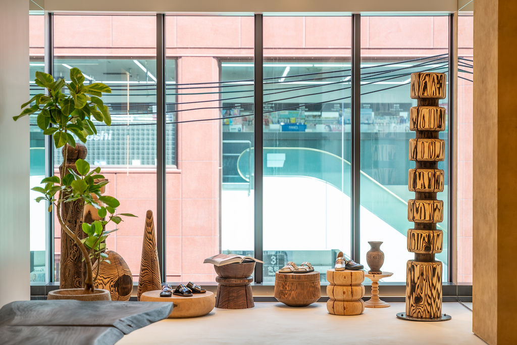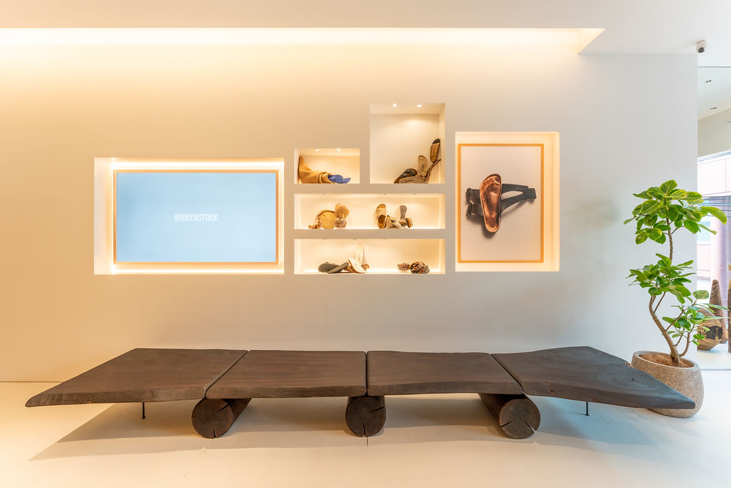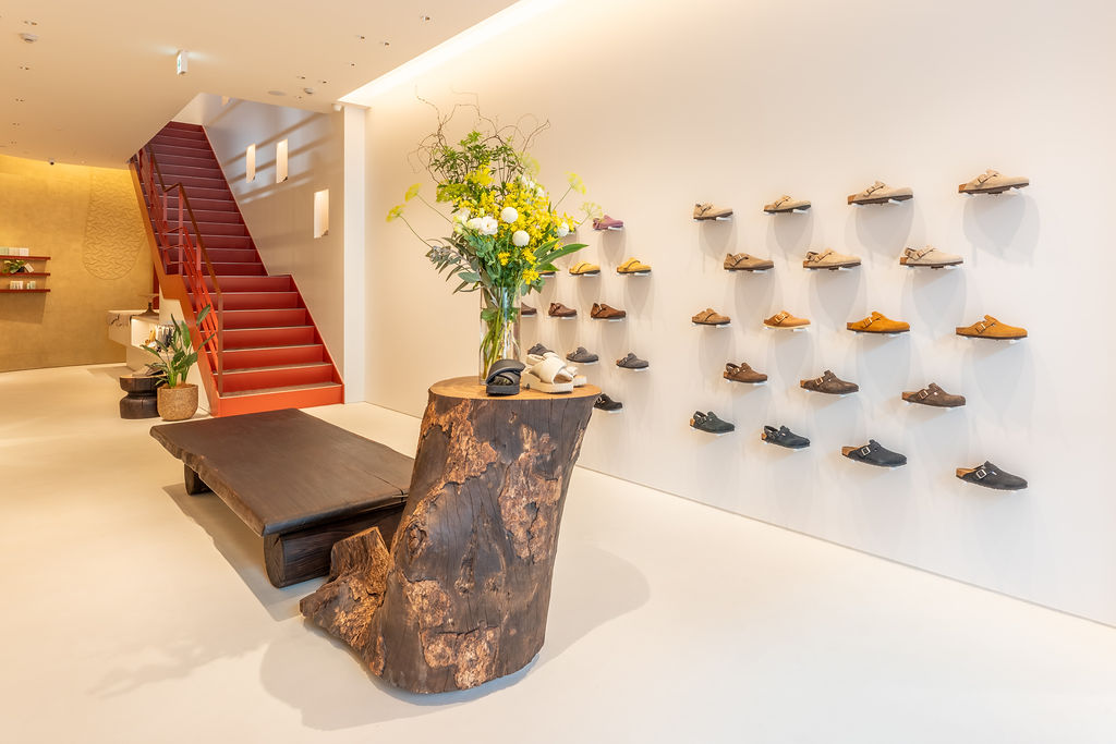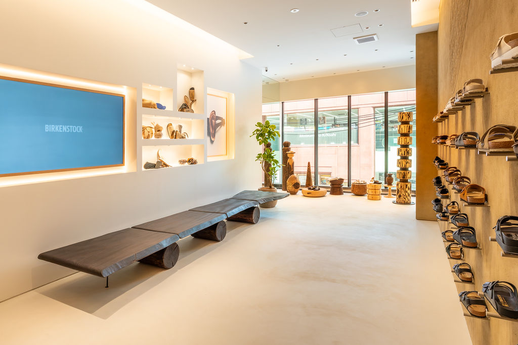 The interior is defined by a refined minimalism that brings BIRKENSTOCK’s craftsmanship and materiality to the fore. A predominantly white colour palette is complemented by traditionally crafted earthen walls, while signature elements such as cork and the brand’s distinct bone pattern are carefully integrated throughout the space. Introducing an organic counterpoint to the gallery-like setting are sculptural stools and fixtures by wood artist Naruki Takahashi. Each piece, carved from solid wood, is one of a kind—resonating with BIRKENSTOCK’s enduring purpose to enable people to walk naturally. Despite its central location, the store offers a calm, grounded atmosphere where visitors can engage with the products at their own pace.