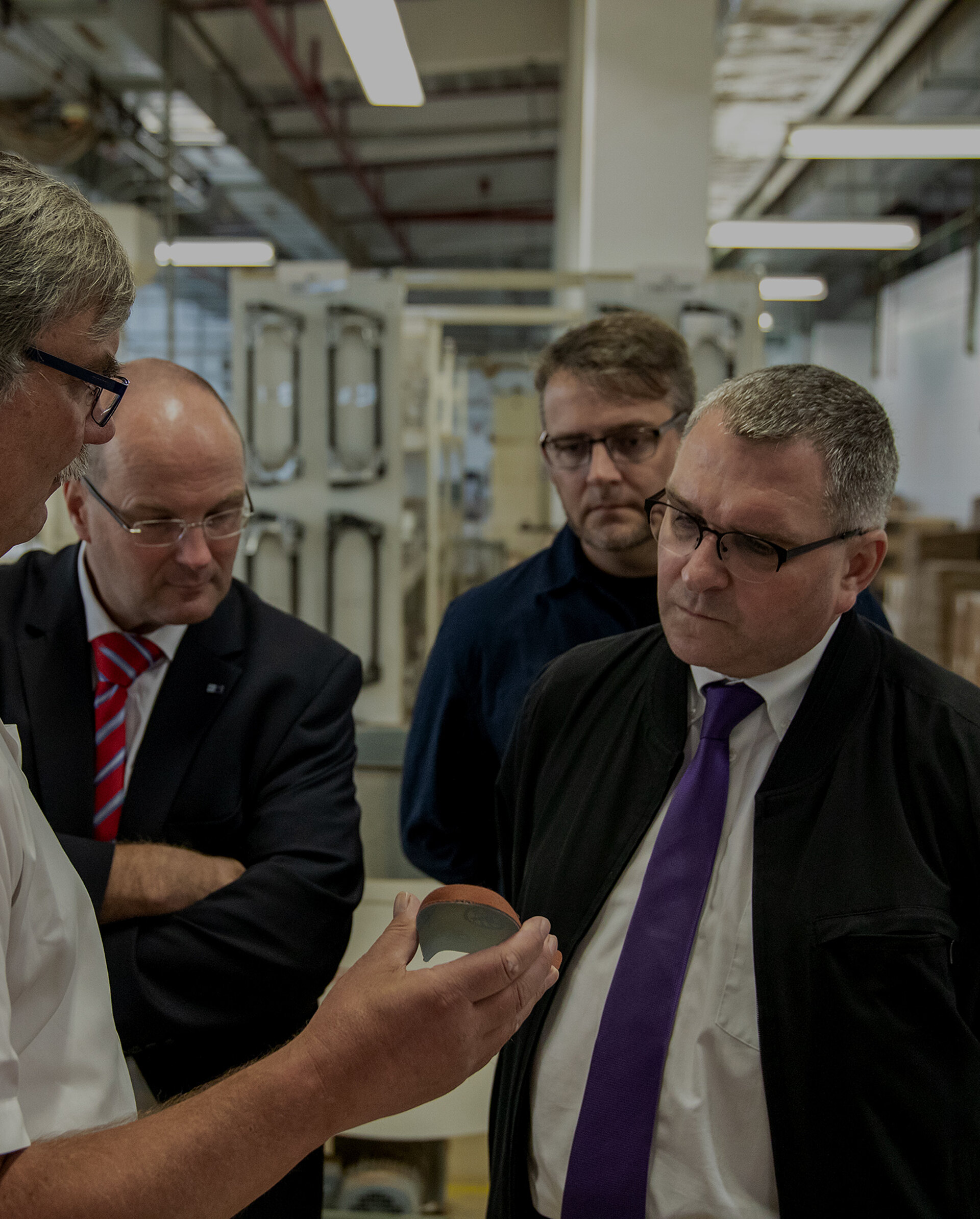 Darüber hinaus konnten sich Malte Jörg Uffeln, Bürgermeister der Stadt Steinau an der Straße, Dr. Gunther Quidde, Hauptgeschäftsführer der IHK Hanau-Gelnhausen-Schlüchtern sowie Daniel Müller, betreuender Gewerkschaftssekretär der IG Metall, im Austausch mit Sean Harris, Chief Administration Officer der BIRKENSTOCK Group, dem Geschäftsführer der Birkenstock Productions Hessen GmbH, Karl-Heinrich Herber, und der Leiterin der Personalentwicklung bei BIRKENSTOCK, Susanne Söhngen, über die Besonderheiten und die Entwicklung des Standortes informieren.