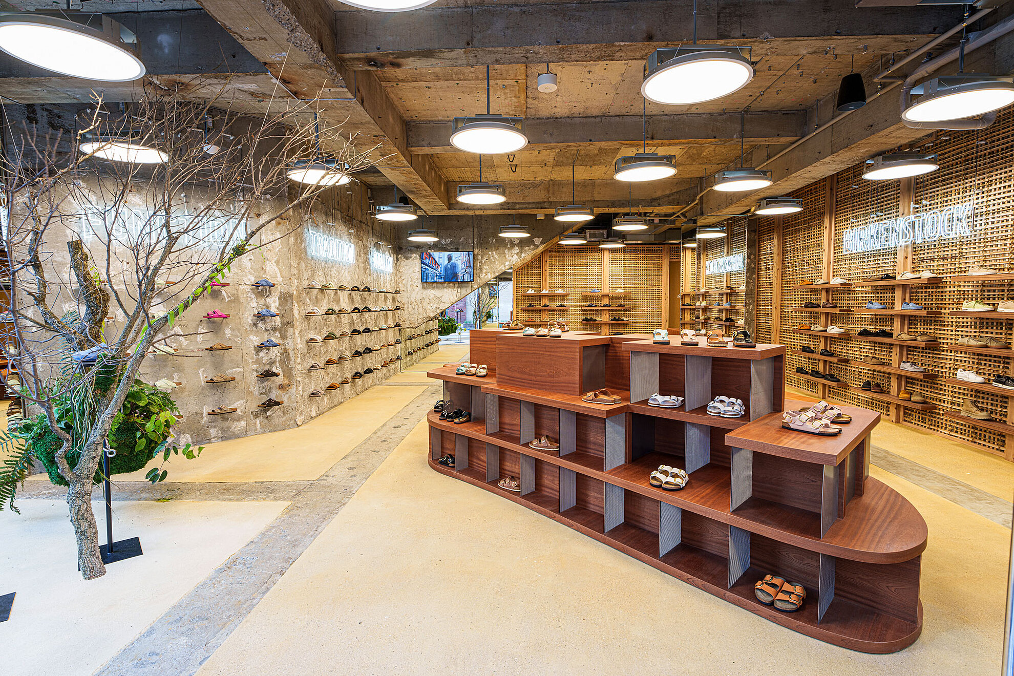 Das Gestaltungskonzept des Stores wird durch eine unbehandelte Betonwand und eine traditionelle Bambuswand, die zum einen die moderne und zum anderen die traditionelle japanische Handwerkskunst repräsentieren, zum Leben erweckt. Die unverputzte Betonwand steht für modernes japanisches Design und spiegelt die Geschichte des Gebäudes wider. Die Neonschilder im Store erinnern an das Nachtleben in den Straßen von Shinjuku, während der Boden des Stores eine Kombination aus dem Gebäudefundament und einer beigen Sandsteinfüllung ist, die an Sand erinnert – eine Anspielung auf den Purpose BIRKENSTOCK‘s, Menschen naturgewolltes Gehen zu ermöglichen. Korkbäume in den Schaufenstern symbolisieren das natürliche Material welches das Herzstück eines jeden BIRKENSTOCK Produkts prägt – das Original Kork-Latex-Fußbett.