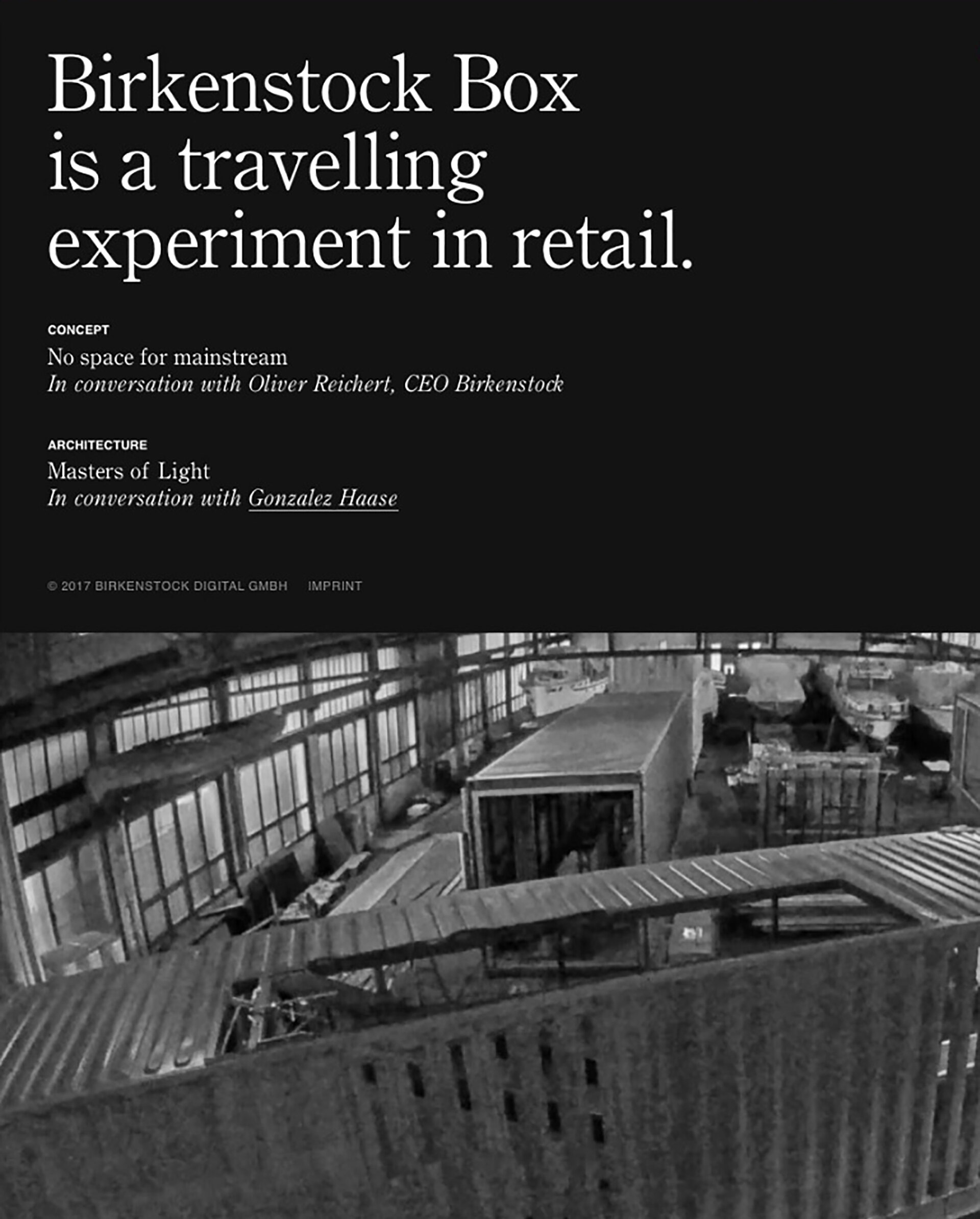 The microsite serves as a digital counterpart to the physical BOX. The platform traces the journey of the BOX around the globe, starting with Andreas Murkudis in Berlin. Correlating to the site-specific interior of the BOX, the microsite allows readers to get a personalized experience through the eyes of the architects, the creative teams who worked on it and the retail partners. The editorial content, which will be updated with each new BOX location, informs, entertains and engages with its audience. The use of imagery – both still and moving – creates a vibrant, dynamic and enjoyable user experience. For the launch phase, the site covers all aspects of the making-off process, as well as candid interviews with the collaborators behind the BOX at Andreas Murkudis, and photo essays by Oliver Helbig. The website engages users on both mobile and desktop. The interactive user journey through the site is intuitive and engaging thanks to its innovative navigation, synonymous with the holistic approach of the BIRKENSTOCK BOX concept. The microsite links to www.birkenstock.com, where the limited edition BIRKENSTOCK shoes exclusive to each location of the BOX will be available.