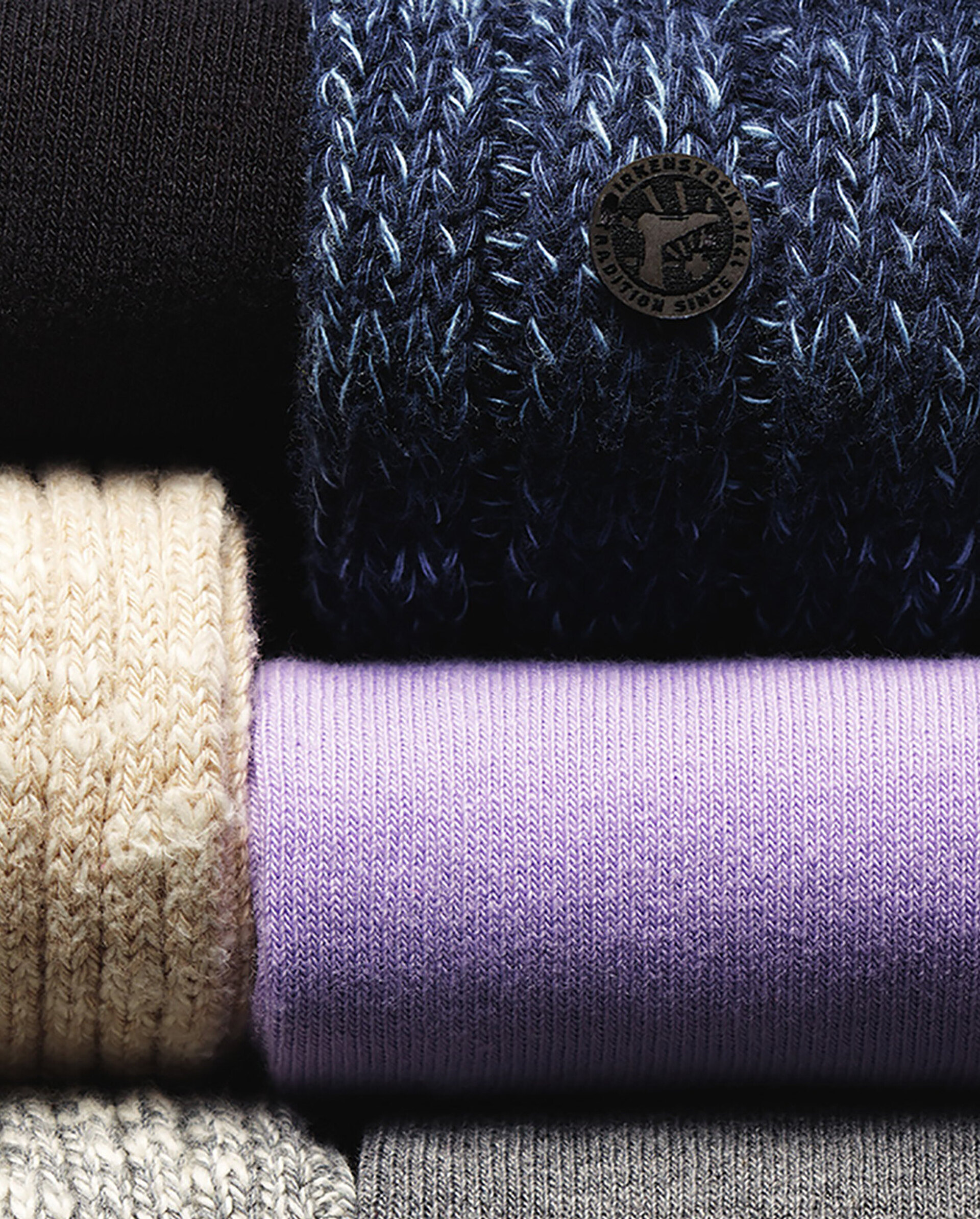 BIRKENSTOCK Legwear offers its premium products in both classic and modern colors. All Basic models, and some of the Fashion models, are characterized by the inclusion of unique BIRKENSTOCK FOOTBED COMFORT SOLE technology. The Fashion models also feature seasonal and innovative elements, with high-quality yarns used to add eye-catching touches. Pressure-free, elasticated cuffs offer firm grip across the range without pinching, whereas reinforced toe and heel sections ensure maximum durability. The materials used for most of the styles have a high content of skin-friendly cotton.