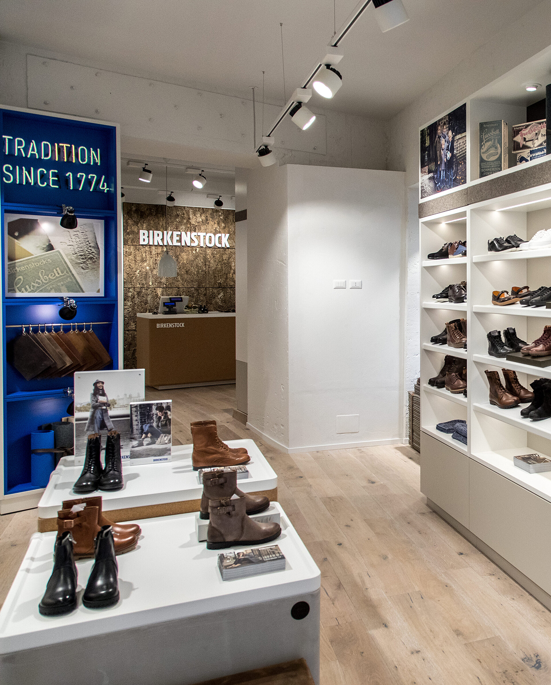 The trendy Tridente shopping district lives up to Italy’s reputation as a leading country for fashion. In the area between Via del Babuino, Via di Ripetta, and Via del Corso, there are many shops of famous international fashion brands and stylish boutiques that offer everything the heart could desire. The new BIRKENSTOCK store is situated here in a historic building with a design concept that illustrates some of the fascinating contrasts between tradition and trends that characterize the famous shoe manufacturer.