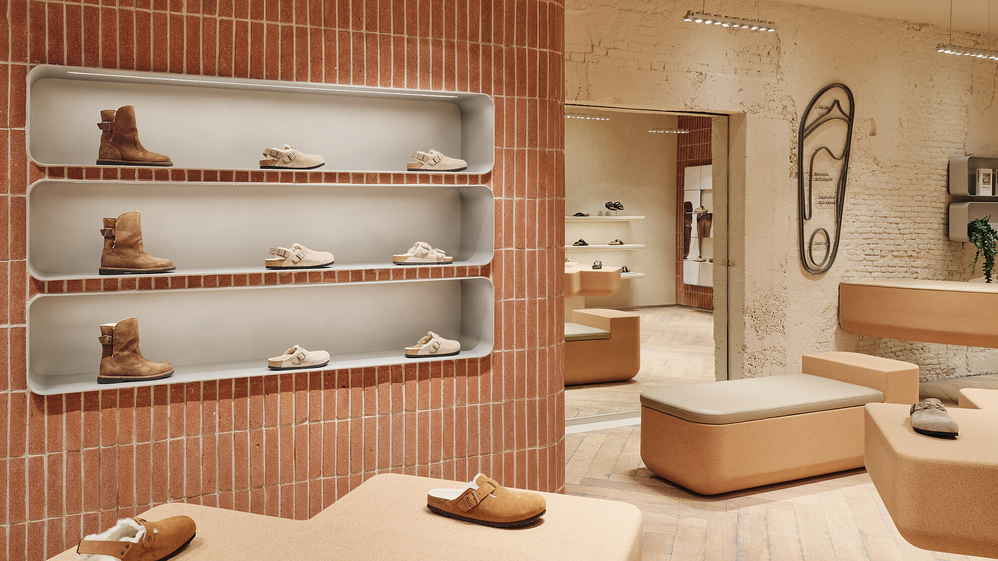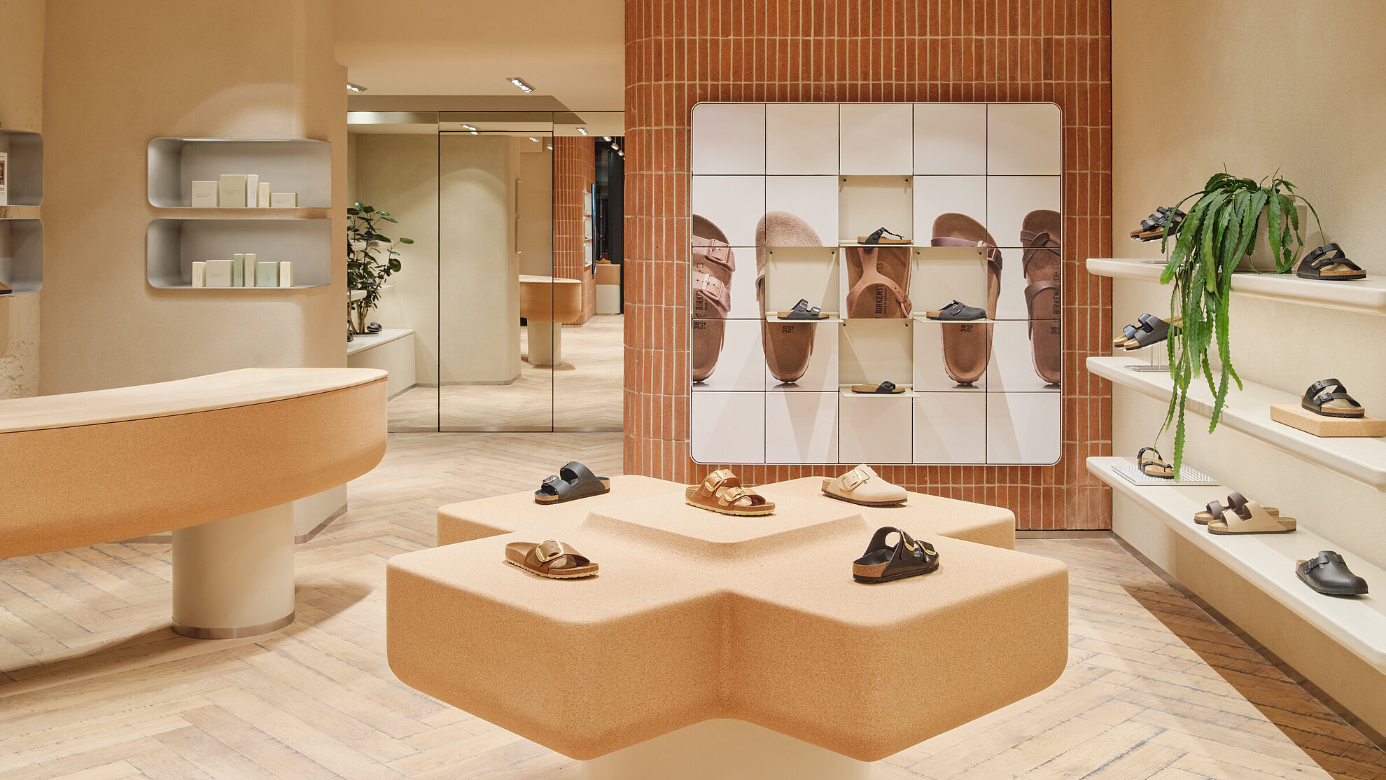 The Amsterdam store design pays tribute to BIRKENSTOCK’s heritage and innovation around foot health. Natural materials such as cork, leather, and stone are paired with design elements inspired by the city itself. A cross-shaped cork table—a nod to the three iconic crosses in Amsterdam’s coat of arms—anchors the space, while recycled stone tiles evoke the architecture of the city’s canal houses. These details ground the store in Amsterdam’s rich history while staying true to BIRKENSTOCK’s core values of function, quality, and tradition.